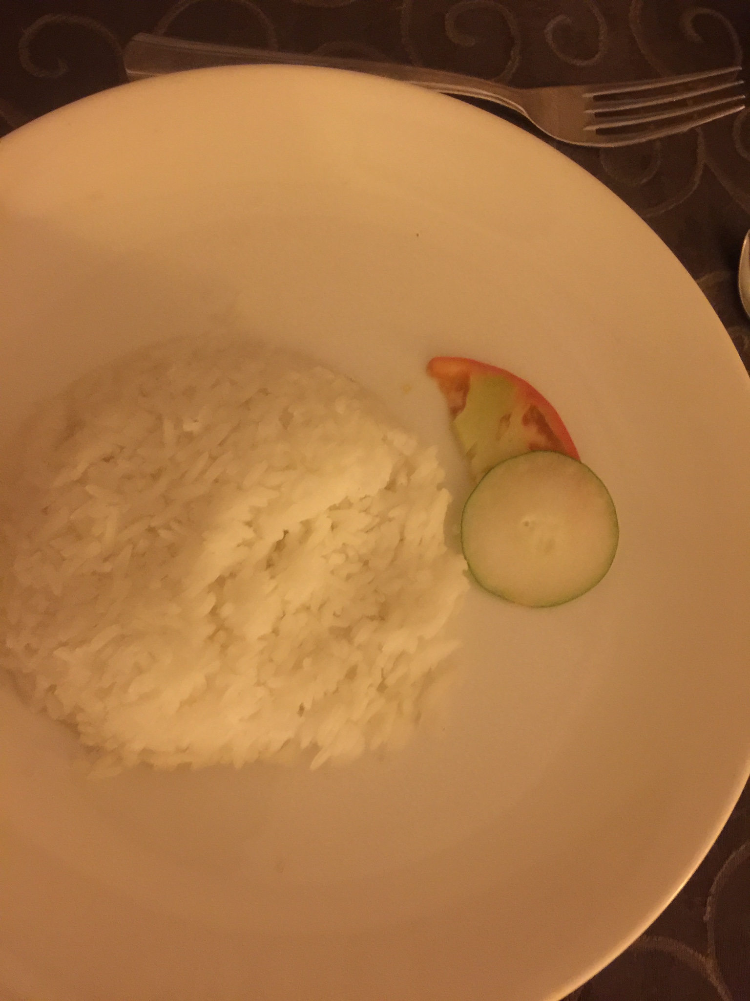 We were surprised again, however, that little or no effort was put in the in-room dining food that was brought to us. For adobo with rice at P800, one would not expect to see rice presented just this way (with one weird slice of tomato and cucumber):